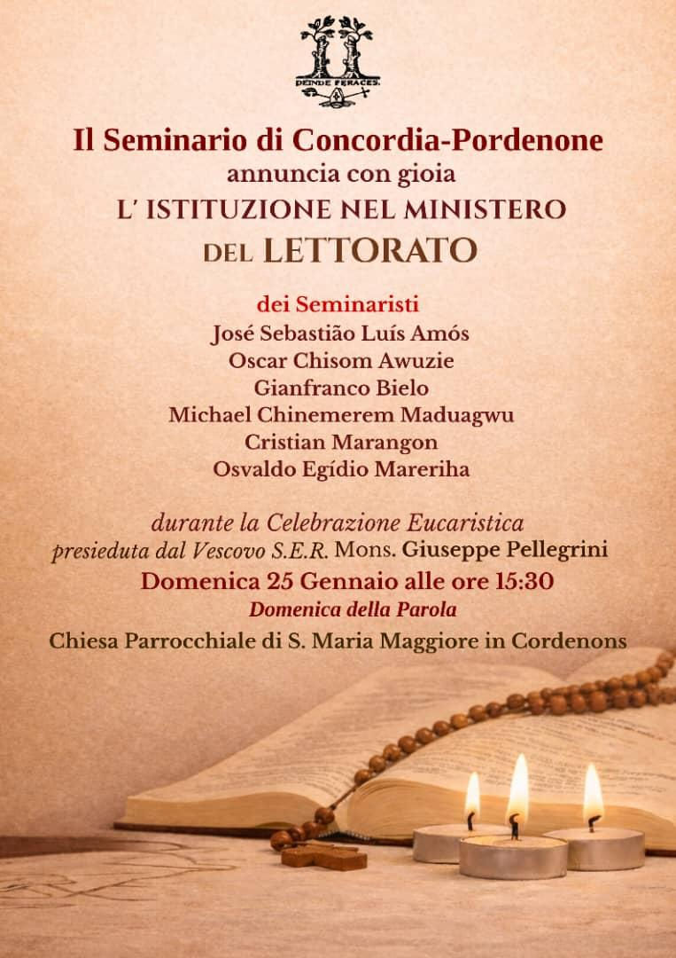 Istituzione del Ministero del Lettorato Santa Maria Maggiore Cordenons5 giorni faTempo di lettura: 1 minQuando: domenica 23 gennaio 2026 - ore 15.30Dove: Chiesa Parrocchiale Santa Maria Maggiore in Cordenons